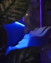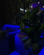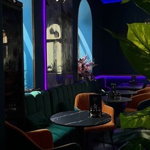 Дизайнеры оформили интерьер зала в ультрамодном стиле с преобладанием серого и голубого цветов. В помещении удобная мебель, приглушенное освещение, неоновые лампы, плотные занавески, оригинальные элементы декора и большое количество зелёных растений - всё это создает атмосферу релакса. Гости могут расположиться на высоких стульях за барной стойкой или на мягких диванчиках возле окон.